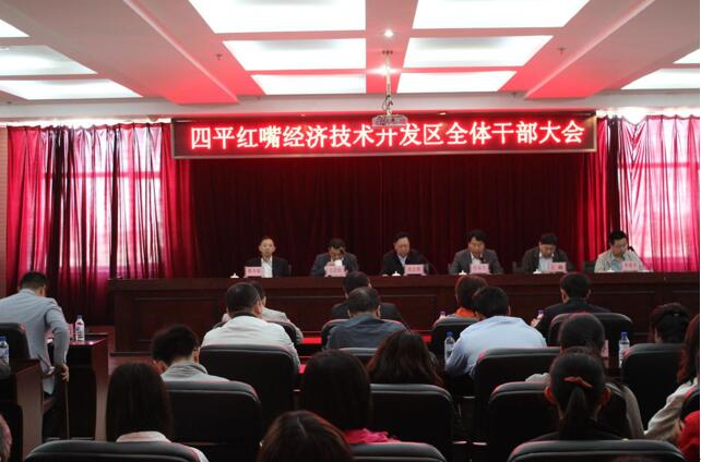 5月9日上午,红嘴开发区召开2018年工作会议,开发区全体班子成员、全体机关干部、两村“三委”主要负责同志、各派驻分局主要负责同志参加会议。